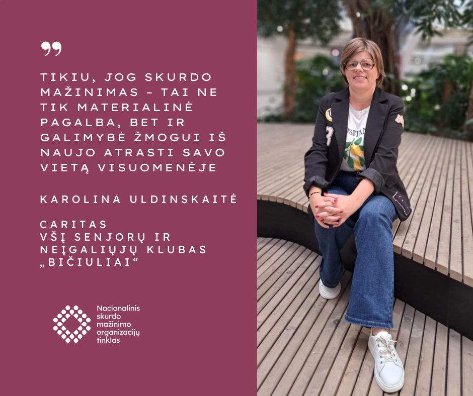 Vilkaviškio vyskupijos Carito socialinė darbuotoja Karolina Uldinskaitė, kuriai padėką įteikė socialinės apsaugoa ir darbo ministrė, dirba su negalią turinčiais asmenimis akredituotoje Socialinės reabilitacijos asmenų su negalia bendruomenėje. Karolina pati turi negalią, tačiau nepaisydama gyvenimo mestų iššūkių, savo pavyzdžiu rodo, kad negalia nėra kliūtis gyventi visavertį, prasmingą ir bendruomenę vienijantį gyvenimą.