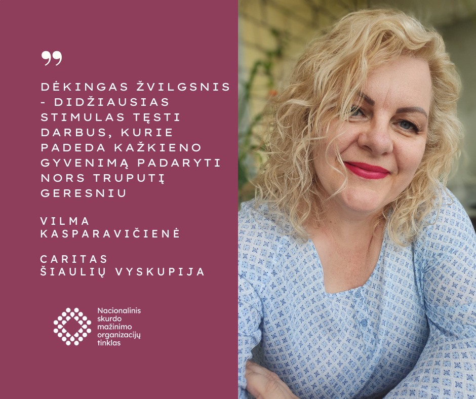 Nuoširdžius sveikinimus siunčiame Šiaulių vyskupijos Carito socialinei darbuotojai Vilmai Kasparavičienei – nepamainomai integralios pagalbos į namus Šiaulių mieste projekte. Jo tikslas – teikti slaugos ir globos paslaugas suaugusiems asmenims su negalia ir senyvo amžiaus žmonėms jų namuose. Vilma taip pat dėsto socialinį darbą suaugusiųjų profesinio mokymo centre „Takoskyra“.